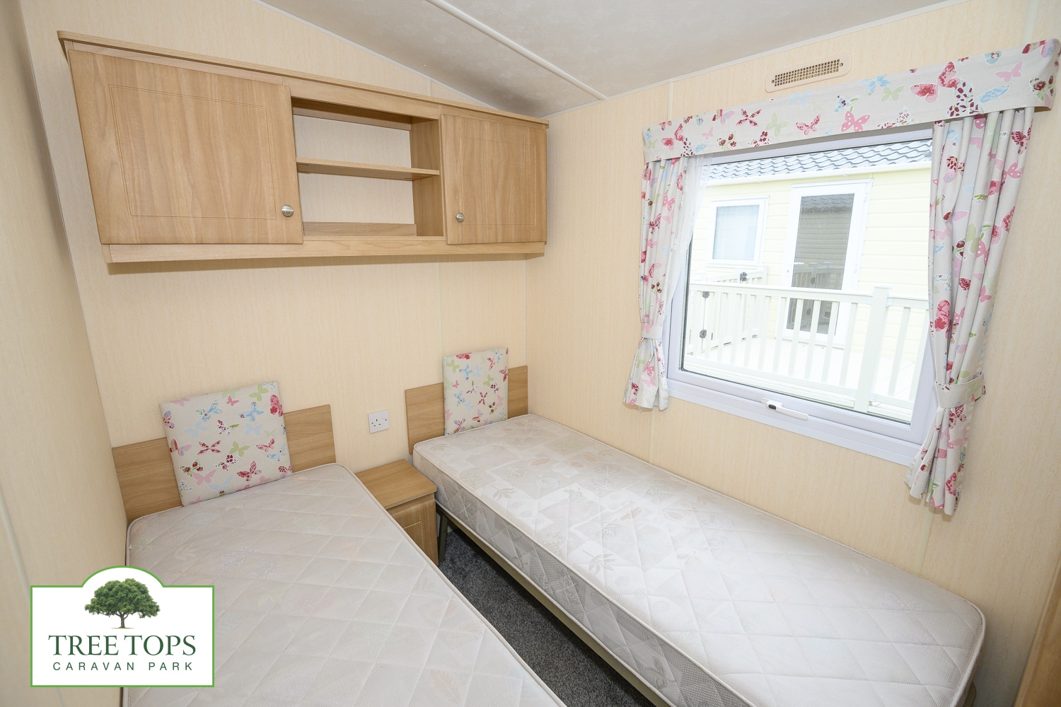 - Bedroom 2 with twin single beds, wardrobe, and overbed storage